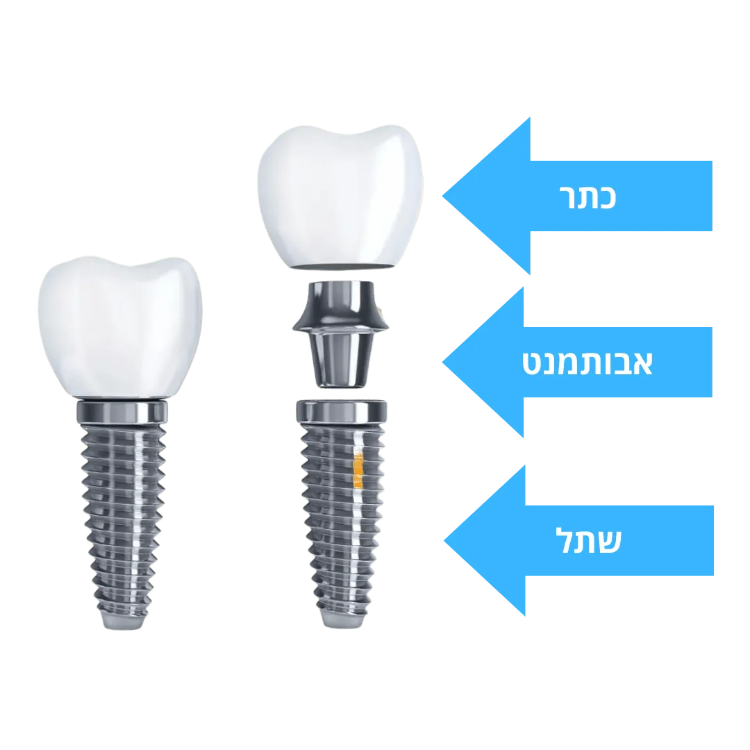 כל השתלת שיניים מורכבת משלושה חלקים - השתל, האבותמנט והכתר. השתל עשוי מטיטניום בדרגת רפואה. החלק הזה מוחדר כירורגית ללסת של המטופל ומשאירים אותו להחלים למשך 4-6 חודשים.