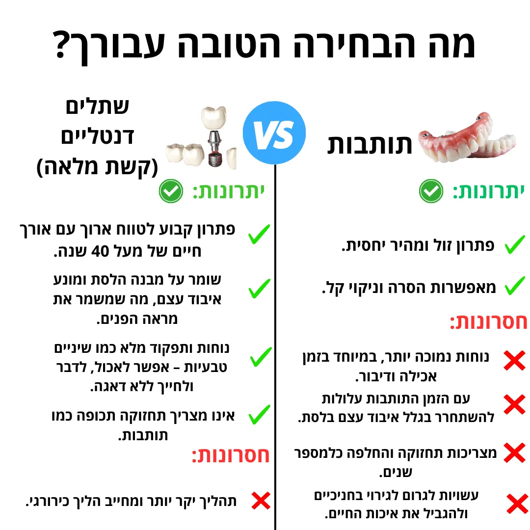 מטופלים כבר לא צריכים להתמודד עם פתרונות זמניים באיכות נמוכה כמו תותבות, גשרים או תותבות חלקיות.