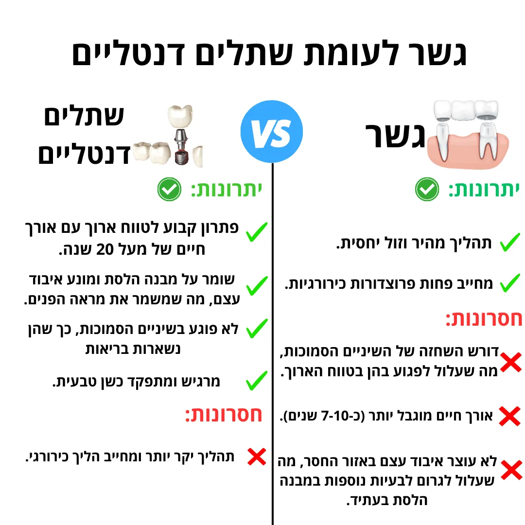 אז מה היתרונות והחסרונות של כל סוג טיפול. ברוב המקרים, אנו ממליצים על השתלת שיניים על פני גשר שיניים, מכיוון שגשרים ידועים בכישלונם לאחר 7-10 שנים.